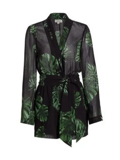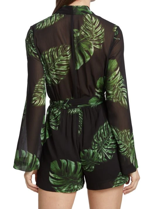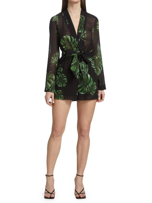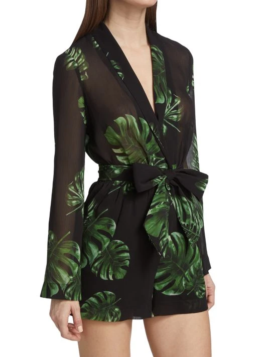 L’AGENCE’s Arabell romper is crafted of sheer chiffon. This delicate style is adorned with a palm-leaf print and a removable self-tie belt.