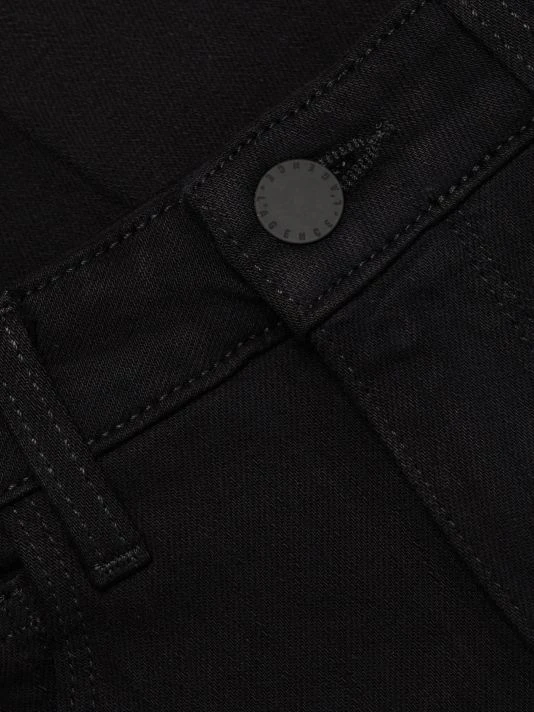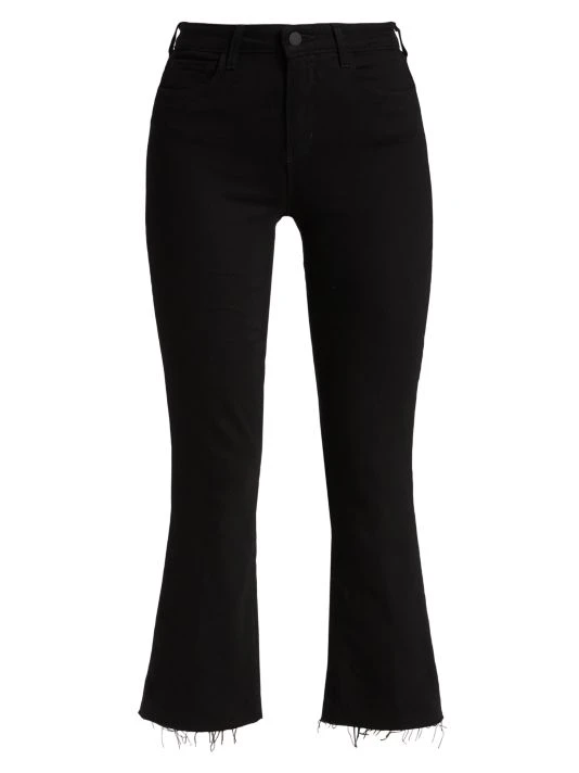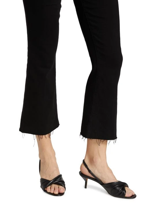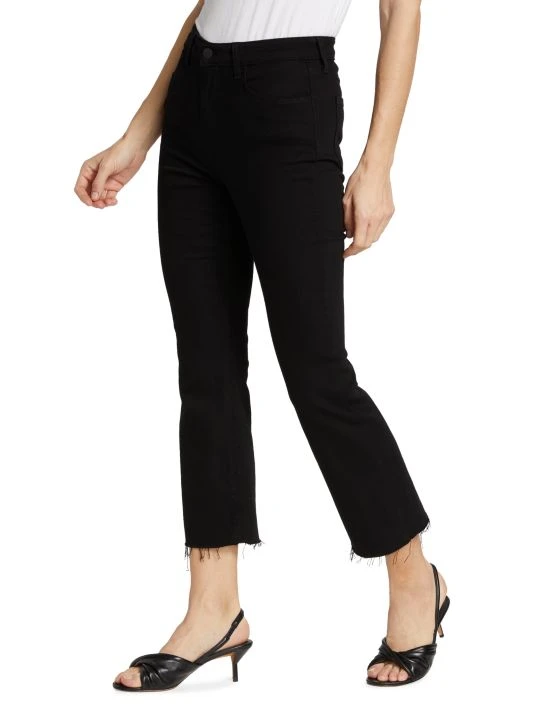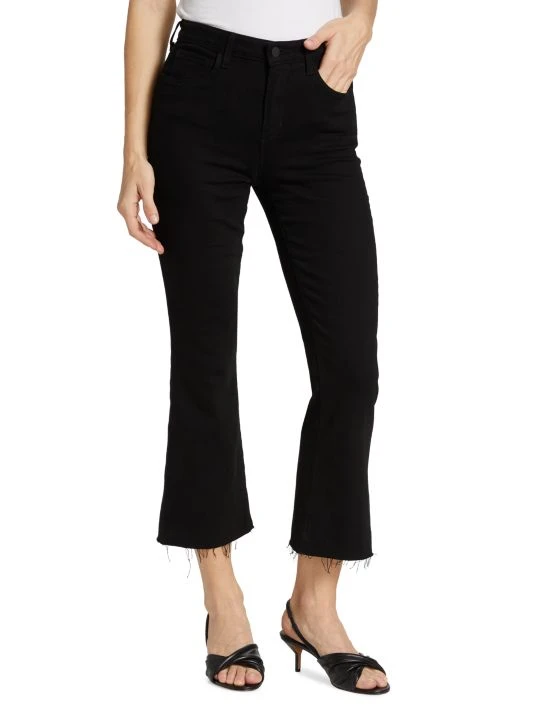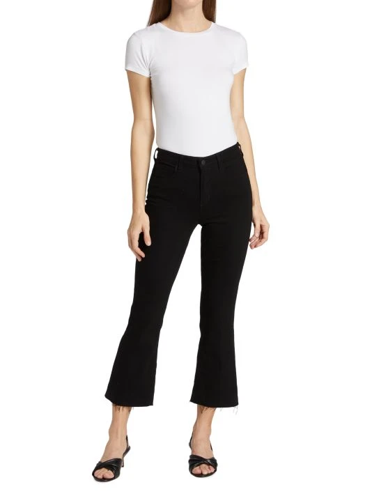 Fitted high-rise jeans taper at leg, ending in a cropped flare with raw-edge hem.