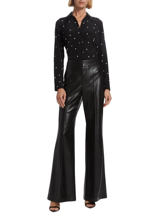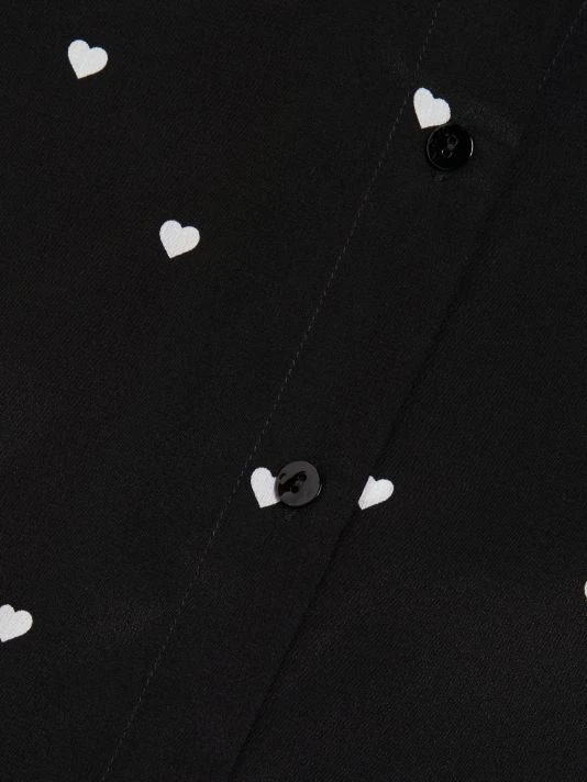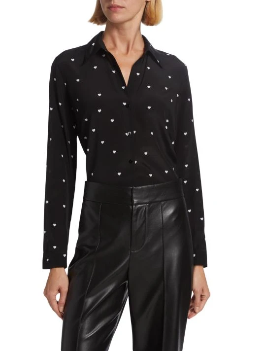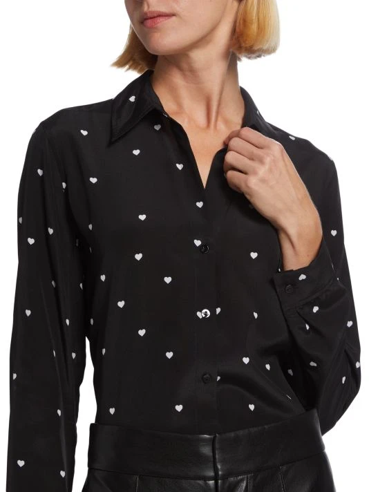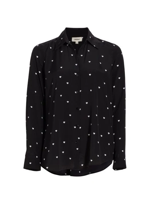 L’AGENCE’s Nina shirt creates a juxtaposition pairing luxury silk with a playful heart motif. This oversized style is enhanced with an inverted pleat under the yoke.