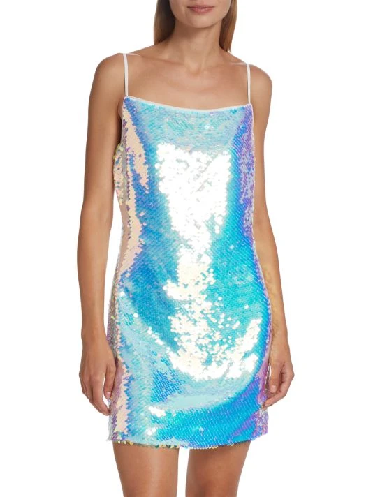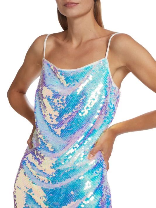 L’AGENCE’s glamorous Nyla slip dress shimmers with iridescent sequins, featuring a stunning cowlneck. Adorned with adjustable spaghetti straps, this style drapes from the tapered waist.