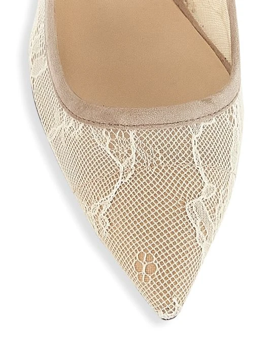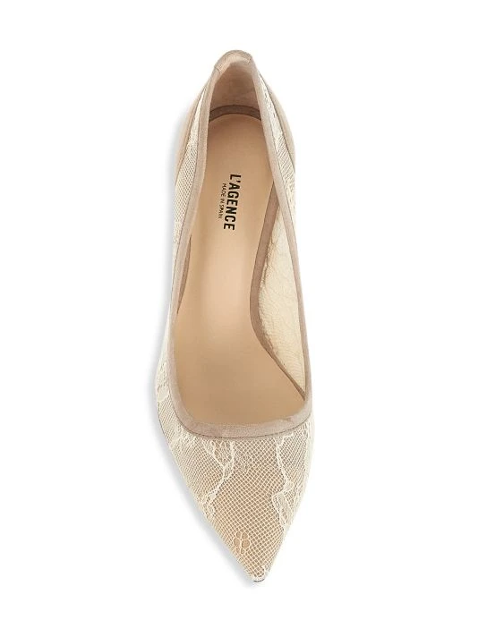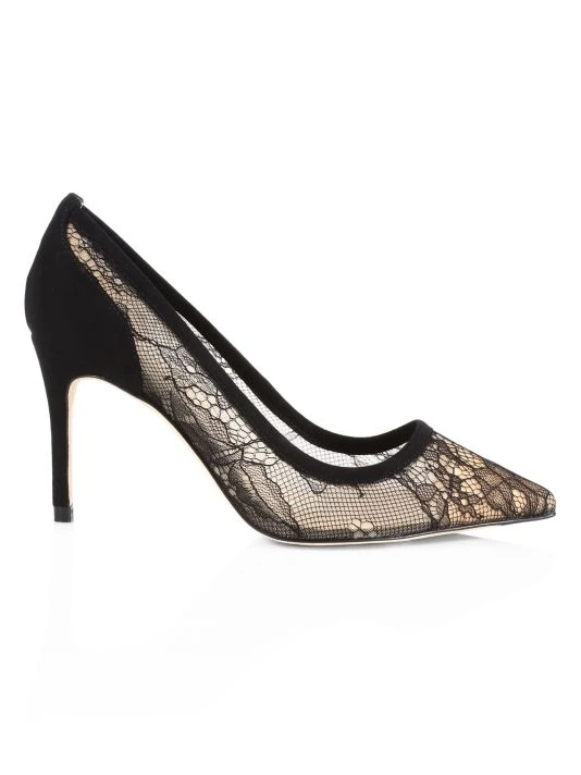 Sultry lace pumps decorated with smooth suede trim and a pointed toe.