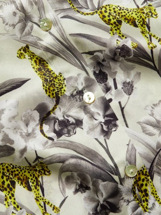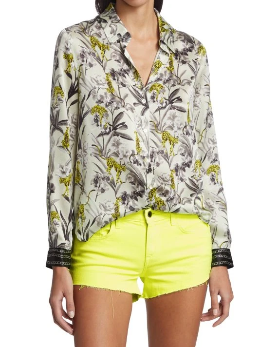 A floral printed blouse detailed with a point collar and curved hem made from lustrous silk.